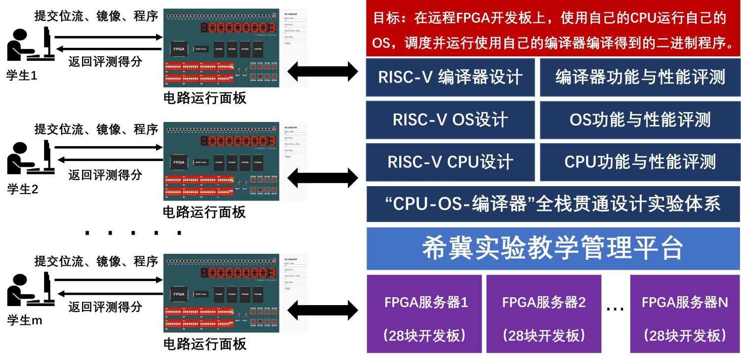 学生提交位流、镜像、程序文件后,平台可自动在远程FPGA硬件开发板上运行学生的CPU电路、OS镜像、程序,评测学生所提交CPU、OS、程序的功能是否正确,性能是否满足要求。根据评测结果,自动为学生所设计的CPU、OS、编译器进行客观判分。